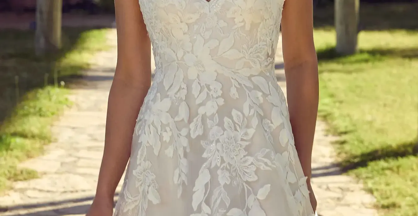 A-Line gown with ivory lace and sequins over ivory tulle, lavender tulle, dust charmeuse lining, lace straps, buttons to end of train.