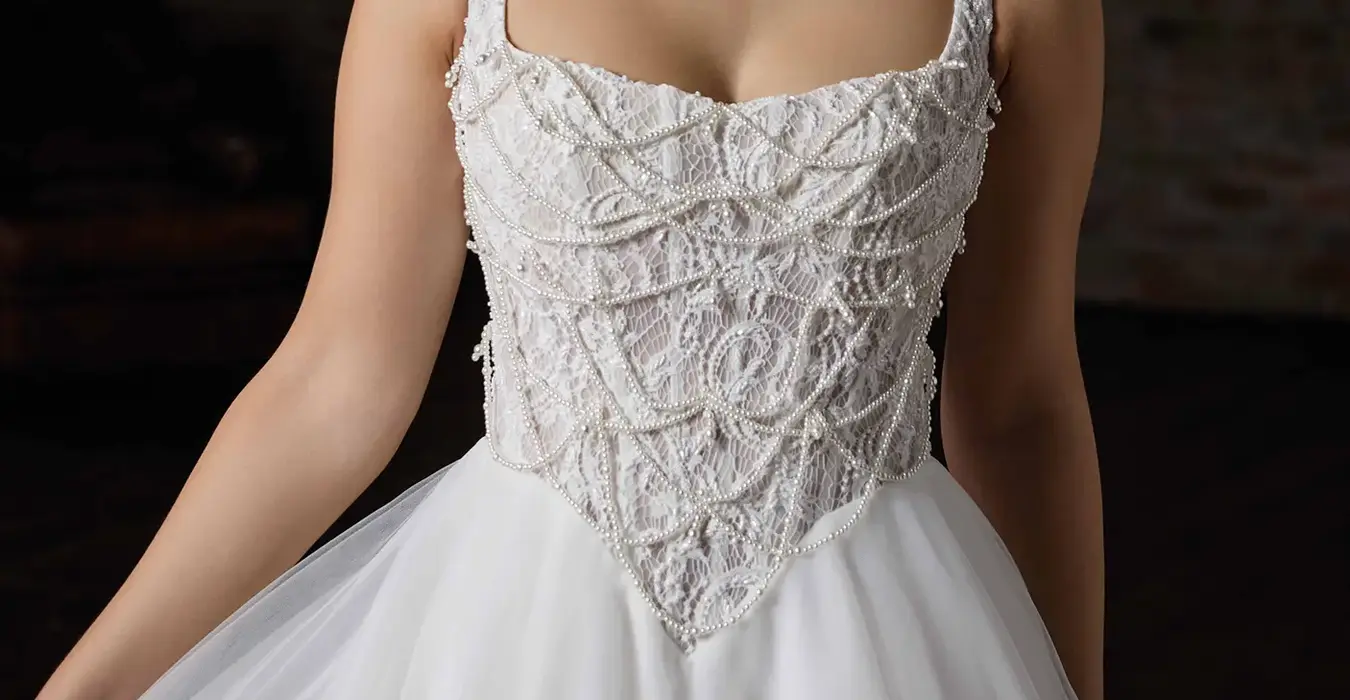 Ballgown in ivory tulle and organza with ivory lace unlined bodice, pearl beaded swags along bodice, basque waist, square neckline with straps, buttons to end of train.