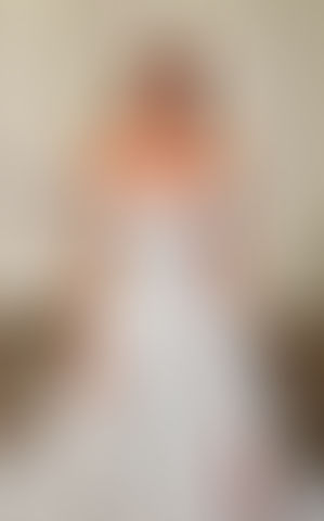 A-Line gown with beaded ivory lace and sequins, sequin-embroidered tulle, Organza skirt, champagne-mocha-skin unlined bodice, attached off-shoulder swags, slit, pockets, buttons to end train.