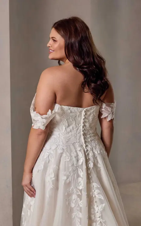 Ballgown with off the shoulder connected swag straps, beaded ivory lace and sequins over ivory tulle, champagne tulle, dust matte lining, skin cleavage, slit, buttons to end of train.