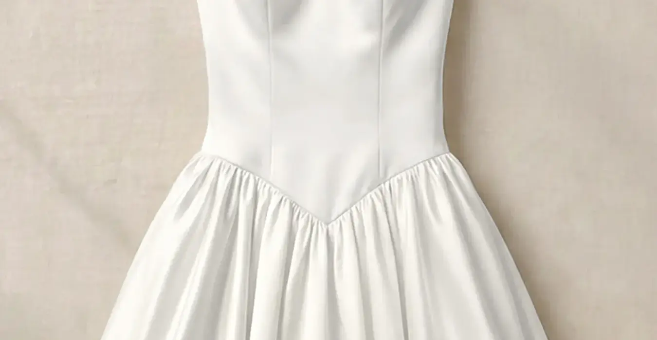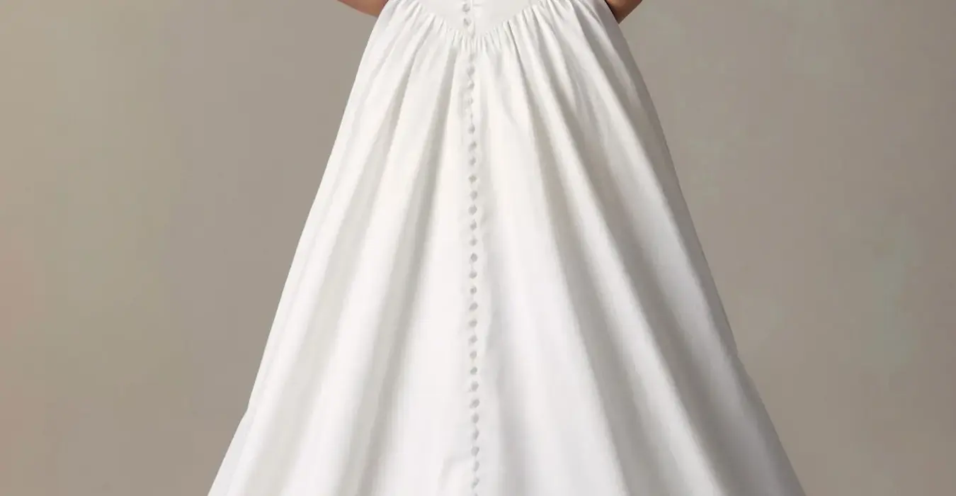 A-line gown in ivory satin, structured bodice with Basque waist, spaghetti straps, pockets, buttons to end of train.