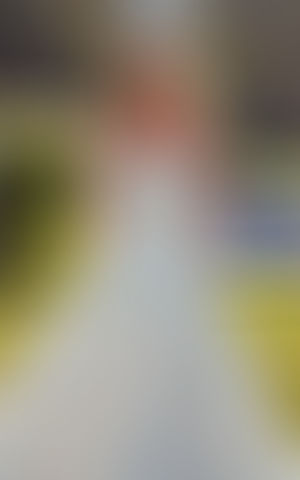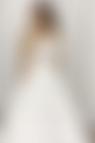 Satin ballgown in ivory, skin cleavage, pockets, buttons to end of train.