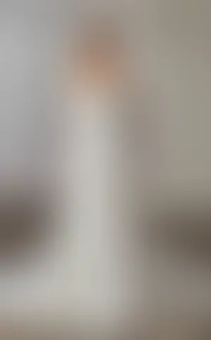 Crepe A-Line gown with Chantilly lace bust detail, eyelash trim, long Chantilly lace sleeves with crepe off shoulder swag, basque waist, slit lined with Chantilly lace, buttons to end of train