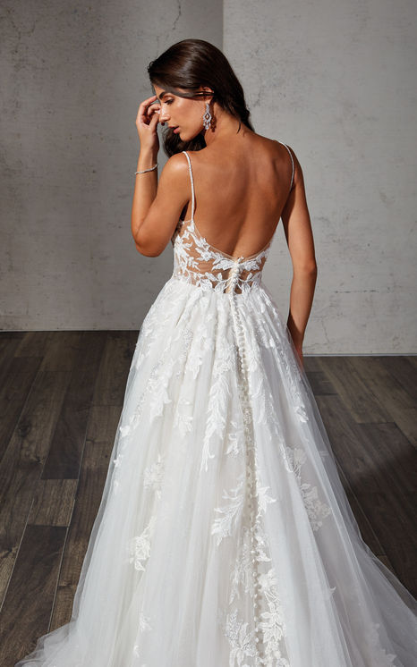 Beaded ivory lace with sequins over ivory tulle, shimmer tulle, dust satin lining, skin-champagne unlined bodice, beaded spaghetti straps, buttons to end of train.