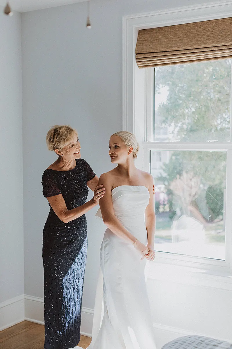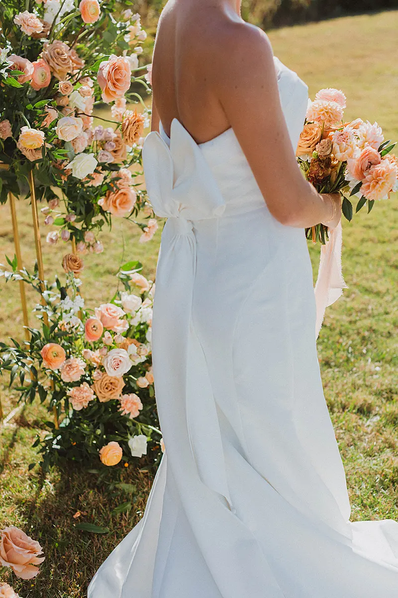 I knew I wanted a simple and chic gown, so walking into my hometown bridal shop I was swallowed by tons of lace and glitz. Lovely! But just not my style. I pulled all of the simple gowns and started trying them on one by one. Soon enough, I put on Nelly by Eddy K and loved the tight silhouette with the modern straight neckline. Even better, the bow on the back which adds a fun twist. As I tried more on, I kept going back until the question was asked, "Lauren is this your dress?" to which I said, YES!