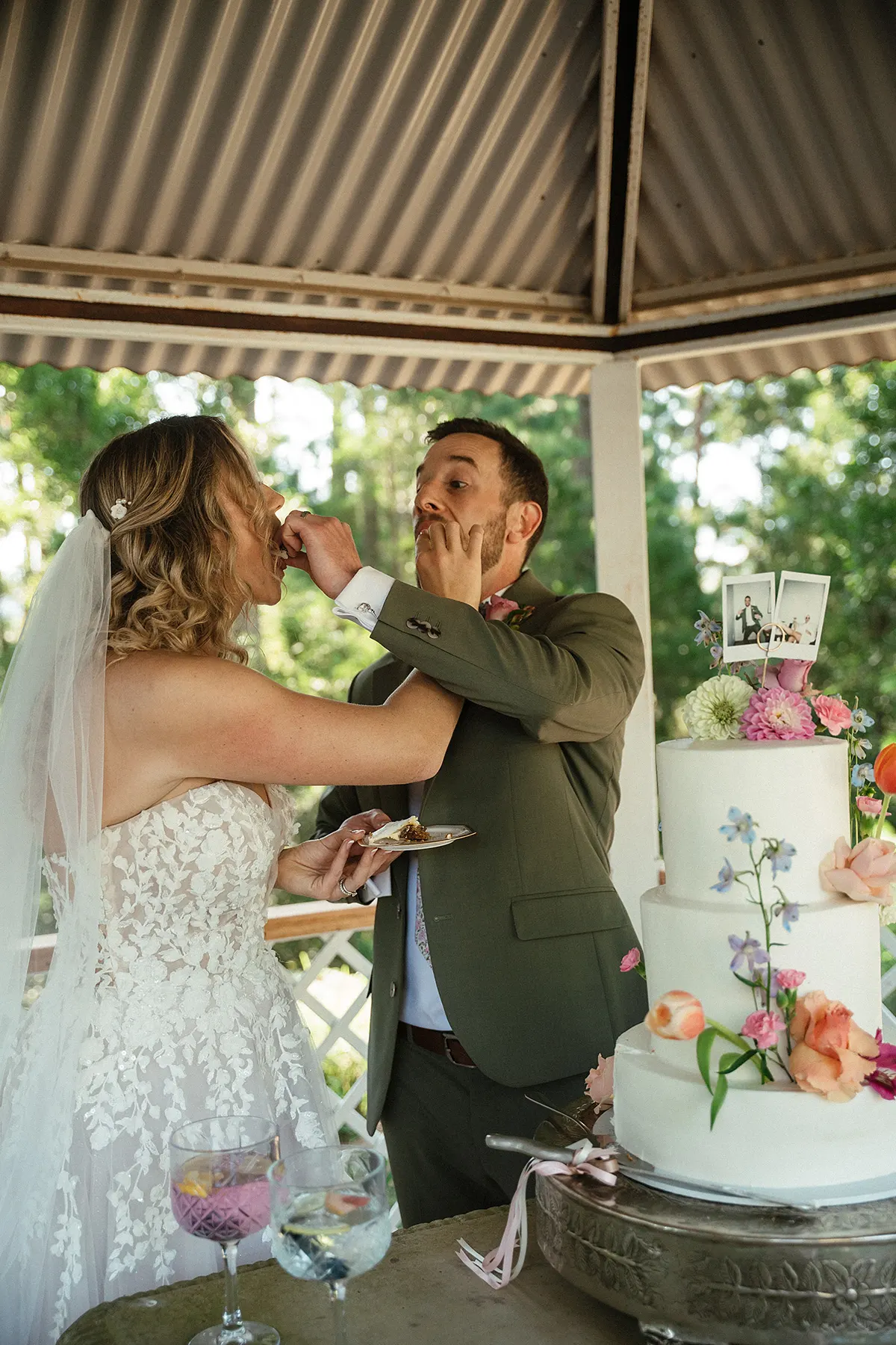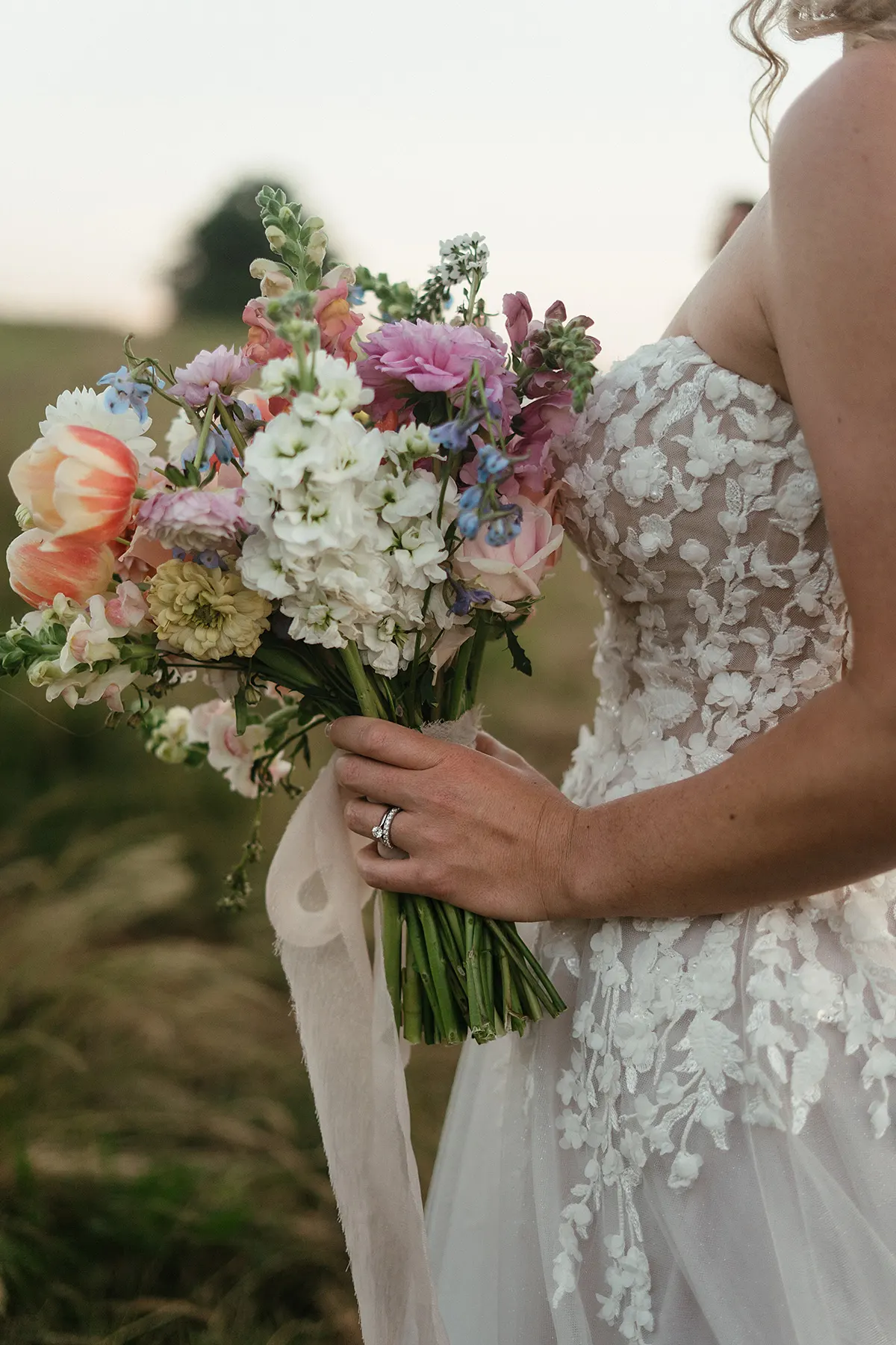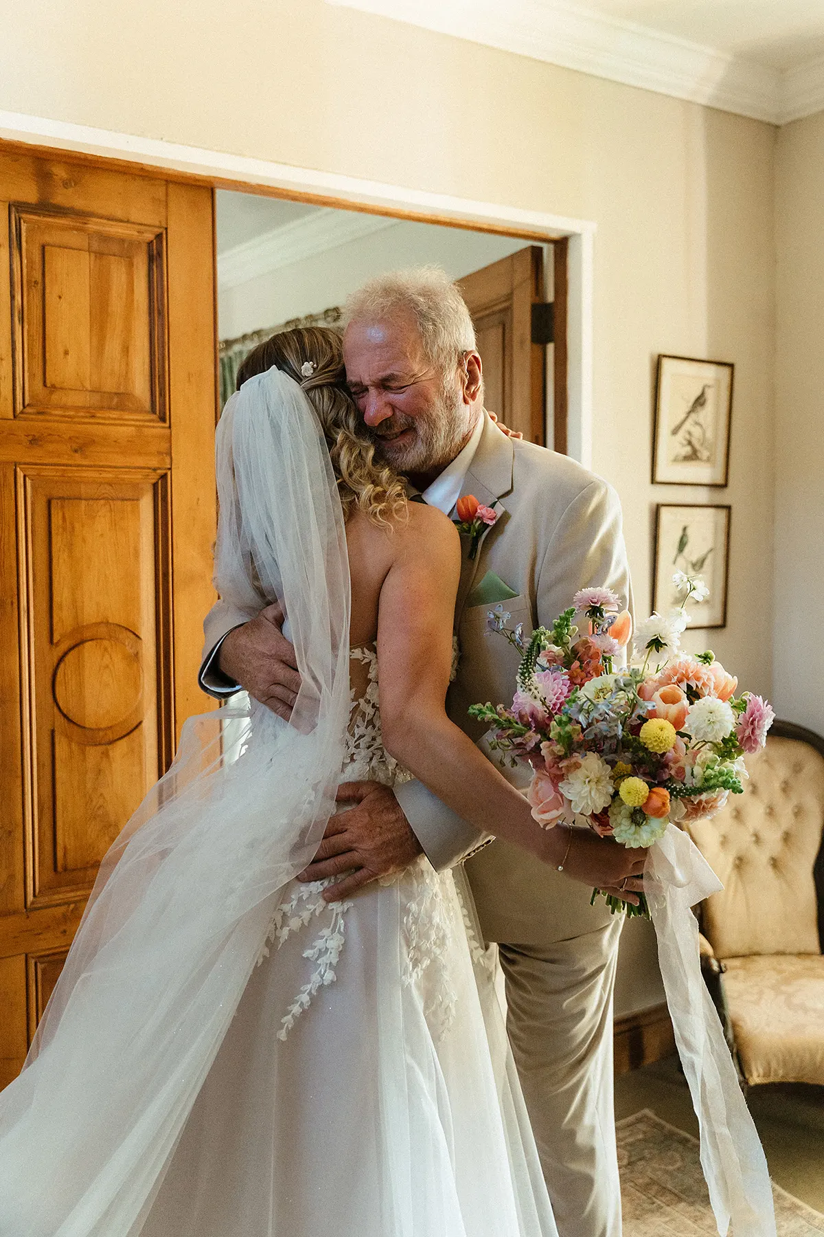 I was on a camping trip with one of my bridesmaids for her daughters first birthday (which was exactly a year from our wedding date) in Leicestershire, England when we decided for a bit of fun, let's find a local wedding shop and try on dresses. Alice Rose Bridal in Ashby-de-la-Zouch thankfully had availability! I told them I was getting married in a forest chapel in South Africa, to think 'Forest Fairy' and I needed to be able to dance to Cotton Eyed Joe in my dress. I tried on a few dresses first but when I tried on the Eddy K dress called Calinda, I knew instantly she was the one! She was so light and freeing, I felt so beautiful, The 3D flowers, the touch of sparkle, the unique colour undertones and the detailing at the back of the dress - She was PERFECT. And of course, the ultimate test; can I dance to Cotton Eyed Joe....and away I went, dancing around the fitting room to my favourite childhood song I had with my Dad. Everyone joining in, laughing and smiling! It truly was the most magical experience! From that day on, I couldn't stop thinking about Calinda. Every dress I tried on afterwards, I'd compare to her. So I knew I had to make one last trip to Alice Rose Bridal to bring her home to where she belonged. - Nikki