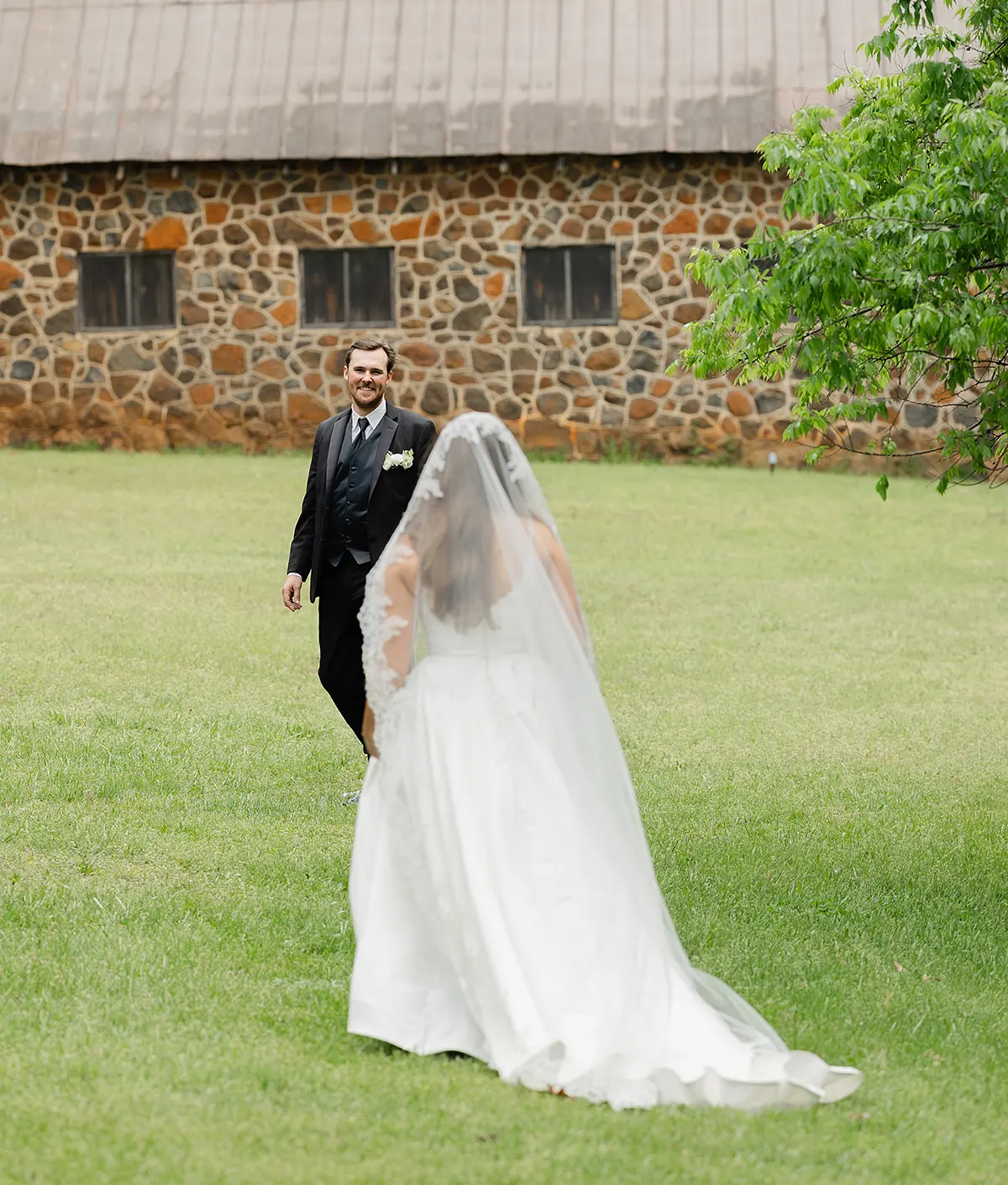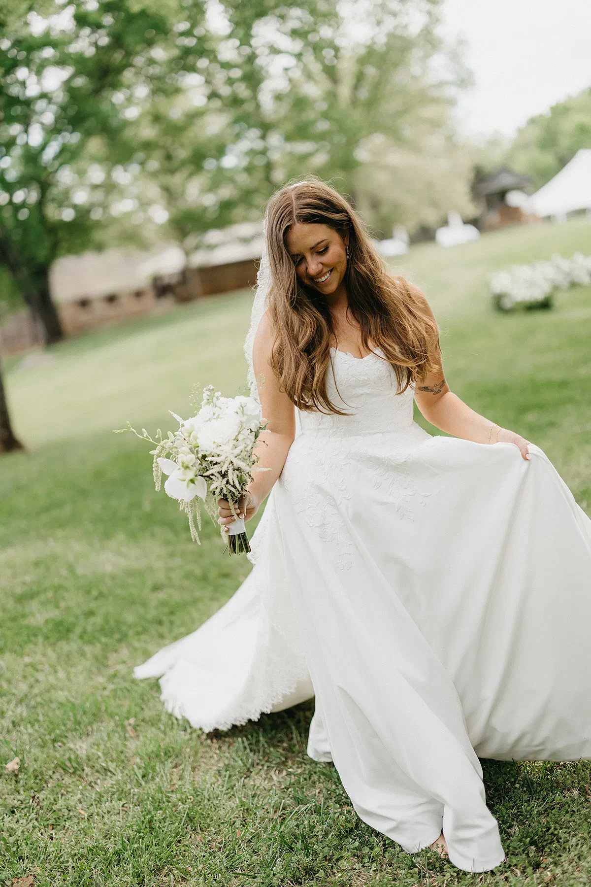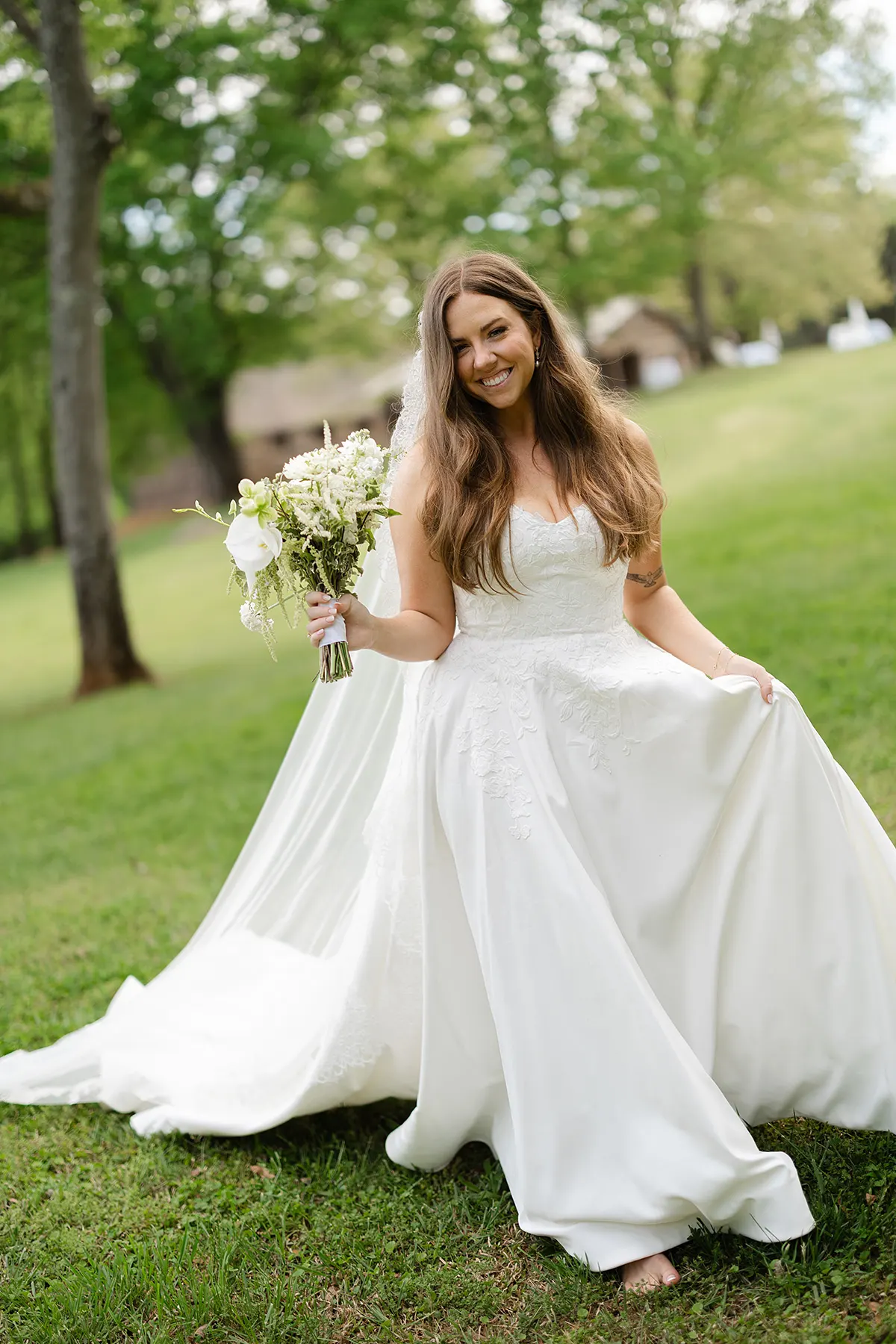 When I slipped into this Eddy K gown at Magnolia Laine in Charlotte, it was actually 12–14 sizes too big and part of a trunk show with only the plus-size sample available. But the girls really listened to what I described, encouraged me to try it on anyway and the moment I did… I saw it. Even oversized, it checked every box. Clean fabric, delicate lace along the bodice and neckline, and the structure I was looking for.
